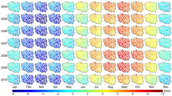 The inverse distance to a power interpolation method was used to interpolate/extrapolate the ∆HM(t)/∆H*M(t) referred to the epoch of 1 January 2008 at the sites of the ASG-EUPOS network (see Figure 3). Figure 15, showing these changes, exhibits clear variability of H/H* at the ASG-EUPOS sites in both time and space domains. This variability can reach 20 mm from March to September. Figure 15 also illustrates that in the space domain, the variability of H/H* over Poland at the same epoch can reach ~2 mm. The H(t)/H*(t) for the period of 2004–2011 over the area investigated can be obtained by adding the interpolated/extrapolated values of ∆HM(t)/∆H*M(t) referred to the epoch 01.01.2008 to the H(t0)/H*(t0) described in Section 4.1.