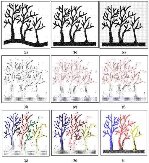 A 2D example showing the various stages of the of the tree segmentation algorithm presented in this paper. (a) The raw input point cloud. (b) The normalized input point cloud before superpoint encoding. (c) Visualization of the voxel divisions for superpoint encoding. (d) Results of superpoint encoding. (e) Results of rough classification. Red indicates ‘canopy’ superpoints, blue indicates ‘ground’ superpoints, and black indicates unlabeled superpoints. (f) Superpoints with a connectivity graph. In this toy example, k = 3. (g) Tree sets (distinguished by color) built by least-cost routing. (h) Three trees (blue, red, green, yellow) formed by grouping tree sets. (i) Mapping the tree labels back to the original point cloud points.