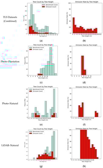 Omission errors are aggregated by tree height. (a,c,e,g) show the number of omissions by tree height superimposed on the number of trees in the validation data of the same height class. (b,d,f,h) show the omission errors as a percentage of total trees within each height class.