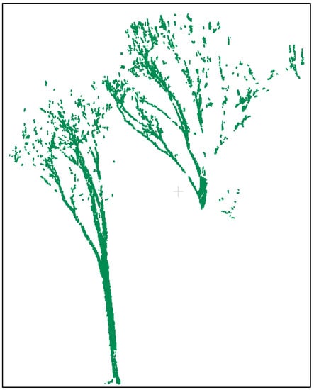 Graph-based methods for segmenting the branching structure of trees from 3D point clouds assume that any given part of a tree must be connected by some path through the structure of the tree to the trunk and root system. Some of the first uses of graphs for modeling trees from remotely sensed data were introduced to create more realistic trees for virtual worlds [,]. Graphs were further adopted by Vicari et al. as a method for applying wood/leaf classification to single-tree point clouds. First, the point cloud of a tree is converted into a network of nodes and edges. Then, under the assumption that a tree is a structure that connects each leaf to the root through woody branches, the least-cost path from each node down to the root of the tree is calculated, allowing each node to be ranked based on the number of paths passing through it. High-use nodes are labeled as branches, while nodes used by few paths are labeled as vegetation [].