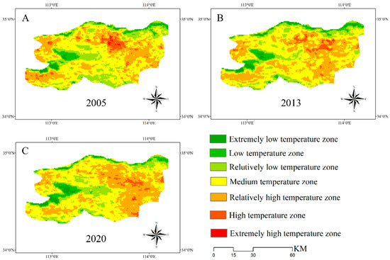 - The spatial pattern of the urban heat island showed an irregular block distribution, gradually spreading from north to south from 2005 to 2020; in 2020, there was a large block distribution in the main city and southeast. In addition, high temperatures mainly occurred in the main urban areas and densely built areas, whereas there was an obvious “cold island” effect in the concentrated distribution areas of forest land and the Yellow River basin.