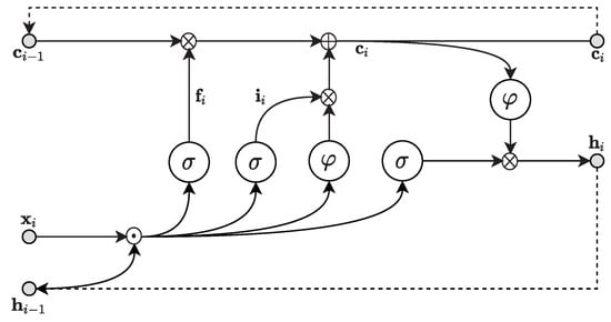 Among the different neural network models proposed in the literature, the long short-term memory (LSTM) [] architecture allows the analysis of temporal effects on the learning process. The diagram in Figure 1 summarizes an elementary part of this model and its interaction. First, let us assume that , , is a set of patterns (i.e., attribute vectors) ordered by the indices i and sequentially submitted to concatenation, element-wise multiplication and vector sum operations (⊙, ⊗ and ⊕), as to the sigmoid () and hyperbolic tangent () functions. Next, we also set the following elements that are used during the training process: and as a vector with the “previous state” and “current” of the network; as a vector comprising “forgetting factors” for each component of the input vector; as a “signal modulation” for input information; and and as the network input and output vectors in the “previous” and “current” states, respectively.