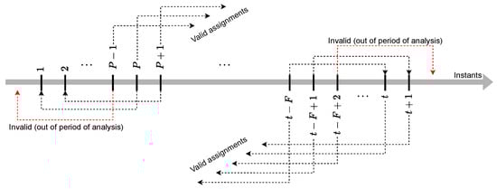For each generic position s and instant ℓ, we assign labels related to the occurrence of anomalies in the next F instants, herein denoted by , where or indicate the occurrence of an algal bloom (i.e., an anomaly) at the k-th instant. These labels are established by an ensemble scheme of majority voting involving thresholding rules on the NDVI, MNDWI, SABI and FAI spectral indices (discussed in Section 2.2). Under these conditions, if all the four spectral indices endorse the occurrence of an anomaly with respect to position s and instant k; otherwise, . The rationale behind using only the instants from to when defining the vectors and is that if we assume , the attempt of retrieve the previous instants to determine will cause a disruption in the lower bound of the time series. Analogously, will cause an upper-bound break when trying to define . Figure 3 elucidates the above-presented explanation.