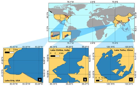 Three case studies covering distinct study areas were carried out to assess the results after training the predictive models. The study areas comprised portions of Lake Erie (USA), Chilika (India) and Taihu (China), as shown in Figure 5.