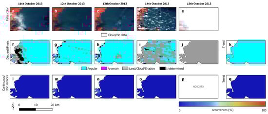 Images (a–e) in false-color composition (NIR, red and green bands) for the Lake Erie study area from 11–15 October 2013. Regular, anomaly, land/cloud/shadow and undetermined samples (f–j) are identified by cyan, magenta, gray and black polygons, respectively; (l–p) show the local anomaly concentration at each instant; (k,q) represent the discrete and local anomaly concentration references for the whole forecasting period.