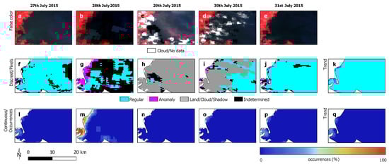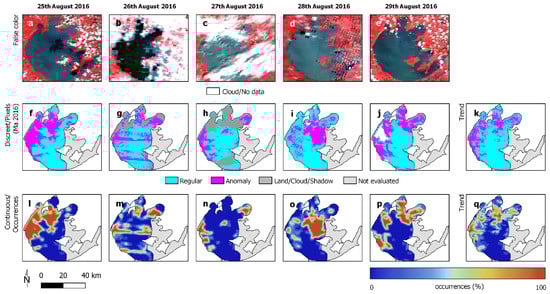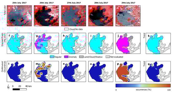 Images (a–e) in false-color composition (NIR, red and green bands) for the Lake Erie study area from 27–31 July 2015. Regular, anomaly, land/cloud/shadow and undetermined samples (f–j) are identified by cyan, magenta, gray and black polygons, respectively; (l–p) show the local anomaly concentration at each instant; (k,q) represent the discrete and local anomaly concentration references for the whole forecasting period.