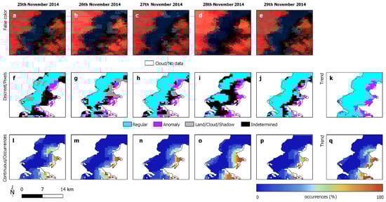 Images (a–e) in false-color composition (NIR, red and green bands) for the Lake Chilika study area from 25–29 November 2014. Regular, anomaly, land/cloud/shadow and indeterminate samples (f–j) are identified by cyan, magenta, gray and black polygons, respectively; (l–p) show the local anomaly concentration at each instant; (k,q) represent the discrete and local anomaly concentration references for the whole forecasting period.