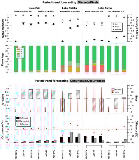 The prediction results and evaluation metrics demonstrated that the proposed methodology was capable of accurately forecasting the algal bloom phenomena for several lake regions, covering different levels of complexity and specificity. Regarding the evaluated forecasters, ABF-RF delivered more regular outputs for the three analyzed study areas, obtaining average scores of 95%, 94%, 51%, 0.38 and 8.22 for the validation metrics of overall accuracy, F1-Score, kappa coefficient, -Score and RMSE, respectively, compared to 90%, 92%, 51%, 0.61 and 20.98 for ABF-SVM and 95%, 93%, 0%, 0.0 and 8.05 for ABF-LSTM.