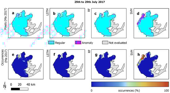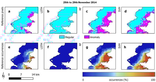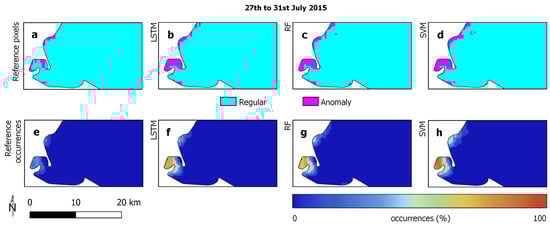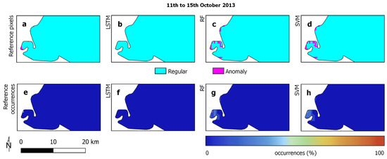 The reference datasets are illustrated in Figure 6, Figure 7, Figure 8, Figure 9 and Figure 10k–q. For the sake of presentation, the estimates at each instant are depicted in Figure 6, Figure 7, Figure 8, Figure 9 and Figure 10f–j and Figure 6, Figure 7, Figure 8, Figure 9 and Figure 10l–p. Table 2 summarizes the number of anomalies and regular positions/pixels regarding the discrete reference of each study area and early instant.