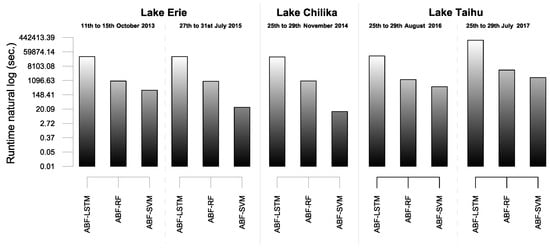 Based on the formalization of our methodology as given in Section 2.3.1, the ABF framework was validated in three different study areas and periods. The SVM, RF and LSTM methods were coupled as machine learning components to the ABF design. By performing an extensive battery of experiments, we verified that the combination ABF-RF was capable of generating predictions that accurately matched the expected results. The consistency of the predictions was demonstrated by computing several well-established metrics that used official data (NESSDC—Lake Taihu) or estimates derived from an ensemble of methodologies that are well-documented in the literature (Lakes Erie and Chilka).