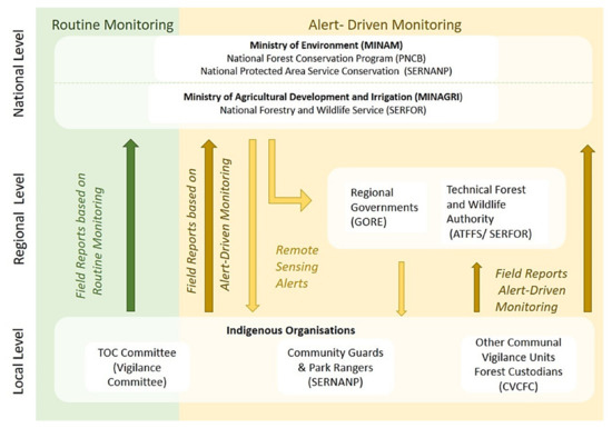 The process of community involvement starts at the national level, identifying and reaching out to communities (local level) to participate in the PNCB. Each community that wishes to participate needs to initiate an establishment process, followed by the demarcation of the territory’s conservation area, and organize their monitoring groups, known as vigilance committees (VC). Communities who participate in the program receive monetary compensation (10 PEN or 2.75 USD per Ha per year) for protecting their forests. Local and national levels both interact with the regional level, which makes arrangements with local offices, prepares base maps, provides training, and offers detailed plans for monitoring practices. Further details of the institutional arrangements for community engagement can be found in Kowler et al. [25].