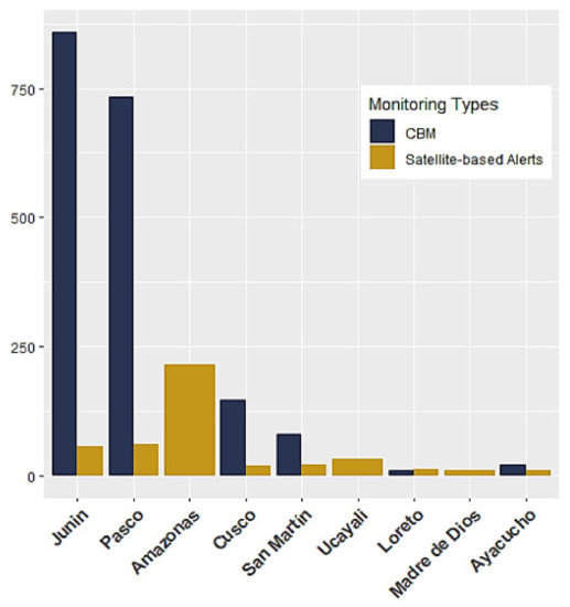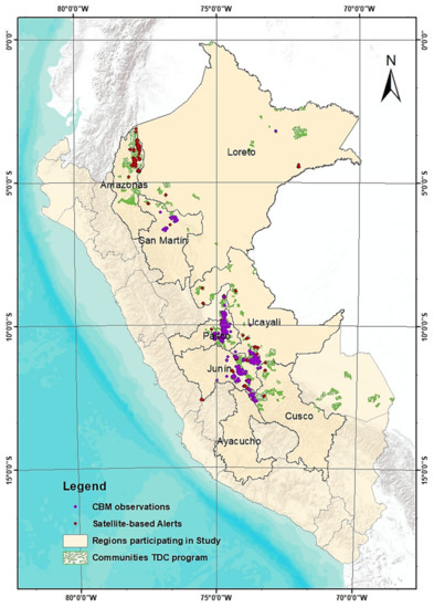 A promising example of an emerging government-driven NFMS that incorporates CBM is Peru’s Conditional Direct Transfer Program, instigated by the Ministry of Environment (MINAM) and implemented by the National Forest Conservation Program (PNCB—Programa Nacional de Conservación de Bosques para la Mitigación del Cambio Climático). It is a novel multilevel institutional approach, operating on national, regional, and local levels, including local and indigenous communities [25]. Within this approach, a variety of different monitoring approaches are used across communities. The alert-driven community monitoring where communities should respond to satellite-based alerts of forest changes is a particularly interesting case study to examine the efficiency and effectiveness of an existing operational CBM system, including its integration between the local and the national level. For example, it was found that satellite-based alerts used by communities reduce deforestation, but some communities rarely receive these alerts [30].