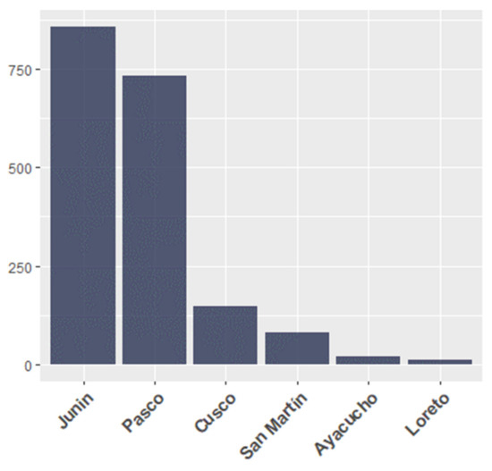 A total of 445 satellite-based alerts were sent by PNCB to communities, and 1853 observations with geographic coordinates from vigilance committees were collected (Figure 2). These observations were collected by 45 different communities, over the six regions of Junín, Pasco, Cusco, Ayacucho, San Martín, and Loreto in Peru. The community of Poyeni had the highest number of observations, while Orejones had the lowest number of observations (Figure 3).