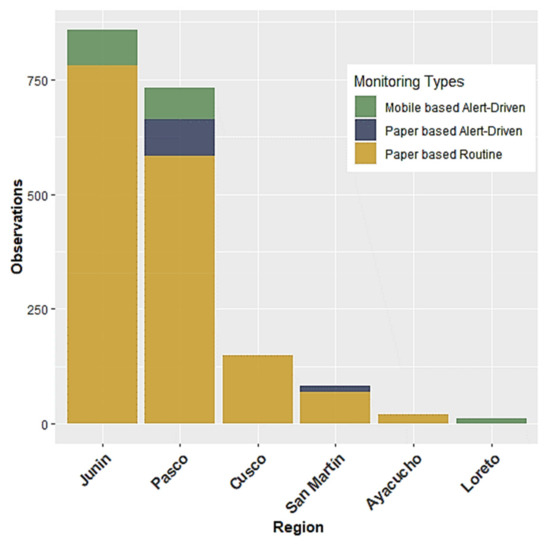 Additionally, it is evident that the only regions that provided information on alert-driven monitoring were Pasco and, to a lesser extent, Junin and Loreto. However, we cannot conclude that other regions were not using alert-driven monitoring. It can similarly be suggested that more data was collected by other communities via paper-based alert-driven monitoring, but not processed at local or regional level. This may be another indication that a paper-based monitoring approach can lead to loss of data and to barriers in the data-collection chain.