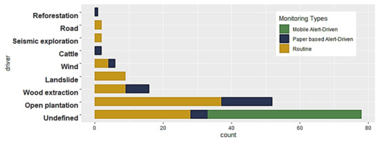 Most alert-driven monitoring took place in 2016, during the time of this study. For the 23 field observations directly related to a satellite-based alert, the number of days between satellite-based alert and field observation varied from 20 days (eight observations), around 60 days (10 observations), to 110–125 days (five observations). All those observations were derived from paper-based monitoring, due to the lack of data in other classes.