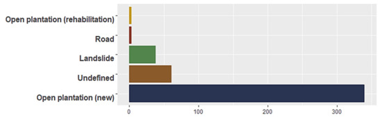 In contrast, information from satellite-based alerts provided fewer categories: Landslide, open plantation (new), open plantation (rehabilitation), road, and others. For community field observations and satellite-based alerts, the biggest percentage of forest change was determined to be caused by conversion to open plantation (Figure 7 and Figure 8).