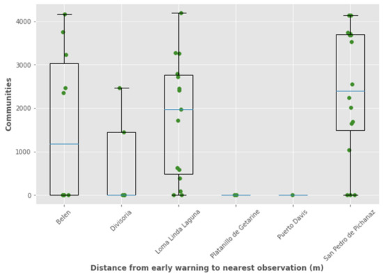 The spatial accuracy (i.e., spatial proximity) analysis showed the shortest distance to each alert-driven monitoring point for 49 samples (Figure 9). Only the communities that used alert-driven monitoring were included in this analysis, all of which were from the Pasco region (Belen, Divisora, Loma Linda, Platanillo de Getarine, Puerto Davies, and San Pedro de Pichanaz).