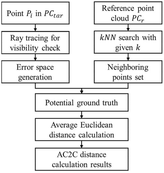 Therefore, to better evaluate the accuracy of the photogrammetric point clouds, the present paper proposes an adaptive cloud-to-cloud (AC2C) comparison by introducing new elements (e.g., ray tracing, visibility check, and error space generation) from the error model of the SfM-MVS to select a more reliable “ground truth” the in . As a result, a more comprehensive estimation for the measurement error of photogrammetric point clouds can be achieved.
