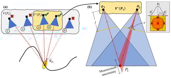 Figure 3b shows the measurement uncertainty of the stereo vision system. The error model is generally based on the BA introduced in the literature review section. For a typical convergent stereo vision system, and represent the optical center of two cameras with a focal length of and is the target point. Since the projection of on the sensor plane may have a certain degree of uncertainty, an inevitable difference exists between the position , which results in a measurement error from the SfM-MVS. Assuming the position of around the actual projection position on the sensor plane following the Gaussian distribution:
