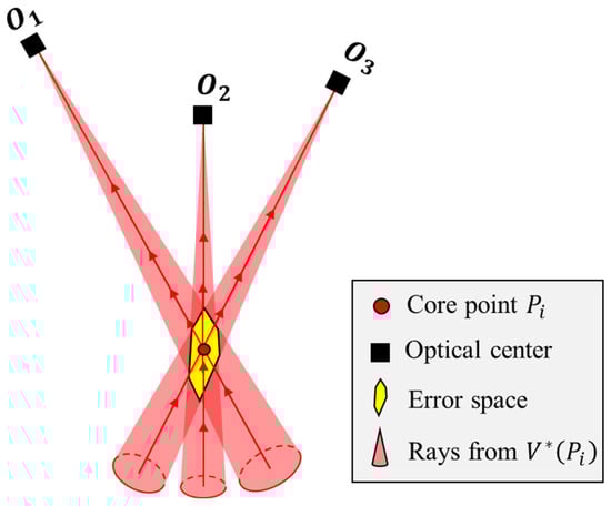 It is challenging to compute the error space of multiple image pairs directly; therefore, the Boolean operation is adopted to approximate the error space in practice. Meanwhile, the convex envelope is applied to increase the robustness of the Boolean operation. Figure 4 displays the Boolean intersection output for three viewing rays, which are represented by the cones in red.