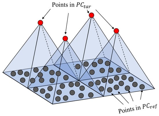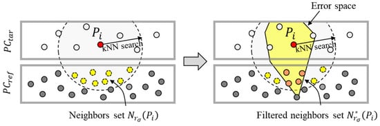 The overall point cloud accuracy can be estimated by comparing all points within the region of interest (ROI). Generally, the point cloud with a higher accuracy is used as a reference point cloud () to check the accuracy of the target point cloud (). The distance between these two point clouds is then considered as the error of the . The cloud-to-cloud (C2C) and cloud-to-mesh (C2M) comparisons are two of the most applied methods [27,28]; however, the C2C method considers whichever neighboring point in the is the closest as the “ground truth” and the C2M searches the “ground truth” from the with a fixed radius. These selected “ground truths” may not be reliable since some false positive candidates remain without a further filtering mechanism, resulting in an uncertainty of the measurement error estimation.