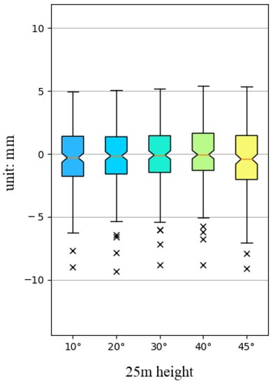 The coordinates of control points measured by the total station and level were taken as the reference values. The difference between the actual and calculated distances between any two control points was considered the measurement error. In total, 18 control points with 153 combinations were used to calculate the error, and the results are presented in Figure 8, where ‘x’ represents the outliers outside 1.5 times the interquartile range above the upper quartile and below the lower quartile. The mean values at different oblique angles were about 1.2 mm, which was smaller than the expected theoretical values (6.85 mm, 7.91 mm, and 3.95 mm) calculated by using Equation (1), Equation (2), and Equation (3), respectively; therefore, an “over-optimistic” evaluation of the accuracy of point clouds may occur in the case of using control points as a reference.