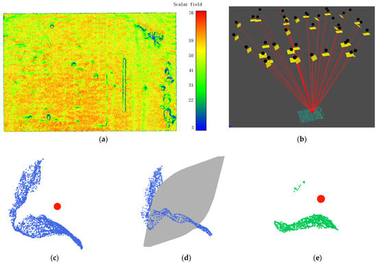 Figure 9 presents an example of the error space estimation and corresponding neighboring points searching and filtering in the SEC. Figure 9a shows the number of visible cameras at different locations in the SEC area. Normally, fewer cameras are visible in regions with a significant elevation variance since the viewing rays are likely to be occluded. Figure 9b shows the visible cameras in for , and the black sphere represents the camera optical center. The sensor planes are highlighted with the yellow rectangles, and the red lines represent the viewing ray leading from the camera center. In this case, was captured by 42 cameras. The angles between the local vector of and the viewing rays followed the requirement stated in the Methodology section; therefore, most of the image pairs in the had an appropriate baseline to perform the triangulation. The Boolean intersection of the viewing rays is shown in grey in Figure 9d.