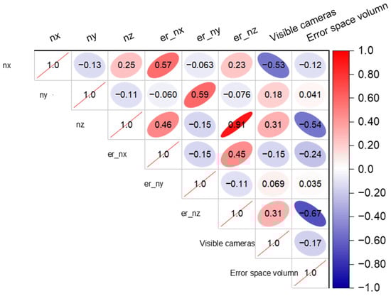 To further investigate the reliability of the estimated error spaces, a Pearson’s correlation coefficient matrix [48] was generated for the key parameters, as plotted in Figure 10. It was found that the orientation of the error space (er_nx, er_ny and er_nz) was strongly related to the local normal vector (nx, ny and nz), which indicates that the ray tracing for the visibility check was able to identify the corresponding cameras that can capture the correctly. Additionally, the volume of the error space negatively correlates to the total number of visible cameras. This means that the more visible cameras there are, the smaller the error space volume, which generally follows the basic principle of the theoretical error estimation of SfM-MVS stated in the methodology section. The results also verified the robustness of the error space estimation.