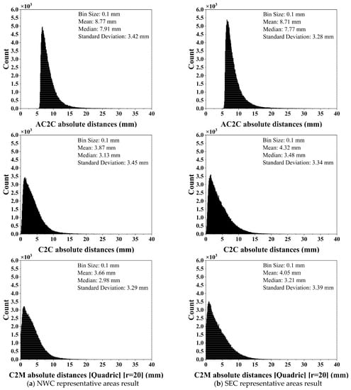 Figure 13 presents the absolute distances calculation result of the AC2C and the two existing cloud comparison methods (C2C and C2M) for both the NWC area and SEC area. In the C2M method, the radius for the neighboring point search was set as 20 mm to provide enough neighboring points, and the local model was approximated with a quadric surface to fit the local change. In the figure, the bin size across all the histograms was set to a consistent width (0.1 mm) for visualization purposes.
