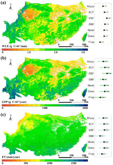WUE is defined as the ratio of Gross Primary Productivity (GPP) and evapotranspiration (ET), and there are several ways to estimate GPP and ET. For example, the eddy covariance technique is used for field measurements, evaluation based on a data mining model or process model, and estimation through remote sensing products []. Given that observed data are very sparse and limit the data mining model’s function, remote sensing data are currently one of the most commonly used methods for estimating GPP and ET at the regional scale []. Many studies have confirmed the applicability of remote sensing data in GPP and ET estimation [,,,,].
