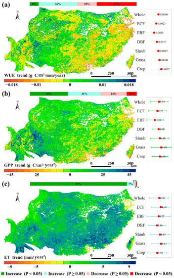Spatial patterns of interannual trends in (a) WUE, (b) GPP, and (c) ET in subtropical China. The top insets indicate the frequencies of significances; spatial pattern of significances is shown in Figure S2. The right insets indicate the interannual trends of WUE, GPP, and ET of different landscapes, with whiskers indicating the standard deviation of all grid cell values.