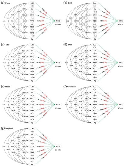 Path diagrams between climate variables (average annual temperature (MAT), annual accumulated precipitation (MAP), and annual solar radiation (Rg), soil water content (SWC), vapor pressure deficit (VPD)), leaf area index (LAI), and elevated atmospheric CO2 (Ca), and WUE in the study area. Numbers on arrows between each factor and WUE represent direct effects, and numbers in parentheses represent total effects. Numbers on arrows between every two factors represent correlation coefficients. (a) Whole of the study area, (b) ECF, (c) EBF, (d) DBF, (e) shrub, (f) grassland, (g) cropland. R2 values beside the response variables represent the variance explained by the environmental factors and the constructed relationships. (α indicates direct effect and β indicates total effect.)