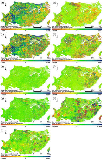 Spatial variations in the actual contribution of (a) GPP, (b) ET (c) LAI, (d) Ca, (e) SWC, (f) VPD, (g) MAT, (h) MAP, and (i) Rg to WUE in the subtropical region of China (STC).