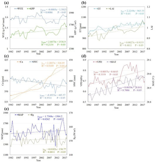 Time series of annual (a) WUE and GPP, (b) ET and LAI, (c) Ca and SWC, (d) VPD and MAT, and (e) MAP and Rg in the STC.