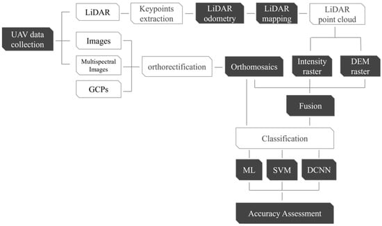 The overall methodology workflow is shown in Figure 1, which summarizes the steps of the proposed approach. Five main steps were performed, i.e., orthomosaic image generation, pre-processing of the LiDAR data, a fusion of LiDAR and image data, classification of the fused data using ML, SVM, and DCNN, and finally analysis of the classification results and accuracy assessment. To train the DCNN model, the orthomosaic images of each of the four RGB combinations were split into 25 images. The choice of 25 subsets was to ensure the availability of sufficient data for training and testing the network and to ensure that each image had a good representation of the targeted classes.