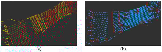 An example of extracted key points: (a) A single LiDAR frame; and (b) Extracted edges (red) and planes (blue).