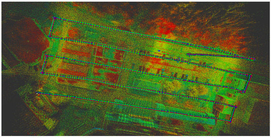 The RGB images were processed with the 12 GCPs using Pix4D mapper software to create a georeferenced orthomosaic image, as shown in Figure 6. The same procedures were followed to create georeferenced orthomosaic images of the five multispectral camera bands, as shown in Figure 7. Then, those orthomosaic images were stacked together using ERDAS IMAGINE software to create a single multispectral image (Figure 8) in the false color combination. The band combination adopted for the false color combination was near-infrared (red), green (blue), and red (green). The LiDAR data were processed using optimized LOAM SLAM software, which was executed on a robot operating system (ROS) in a Linux system. Figure 9 and Figure 10 show the LiDAR SLAM trajectory and the generated point cloud, respectively. The LiDAR point cloud was then processed using ArcGIS software without preprocessing (i.e., denoising) to create a DSM and intensity rasters, as shown in Figure 11 and Figure 12, respectively.