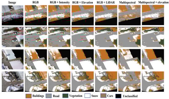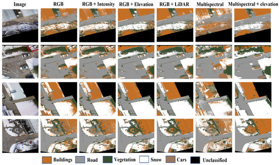 As can be seen in Figure 19, in the RGB case, many buildings’ pixels were misclassified as snow and vegetation. For example, the building in the fourth image was misclassified as vegetation. The pixels misclassified as vegetation were decreased by the fusion of the intensity image with the RGB image because of the sensitivity of vegetation to the near-infrared band, as shown in the same example. The UA of vegetation increased by 8% and the OA increased by 7% compared to the RGB case. The addition of the elevation layer improved the building classification accuracy significantly, where the UA was increased by 40% compared to the RGB case. This is mainly because the elevation information differentiates between the snow on the ground and the snow on the building’s rooftop. The LiDAR/image data fusion obtained the best classification result using the ML classifier, with the OA (82%) and kappa coefficient (75%). The Multispectral case produced the worst classification result, where the OA and kappa coefficient were 58% and 40%, respectively. This poor classification accuracy could be explained by the low spatial resolution of the RedEdge-M camera. However, when the LiDAR elevation data were added to the multispectral image, the OA was improved by 20% and the kappa coefficient increased by 30%, which emphasizes the importance of the LiDAR/image data fusion.