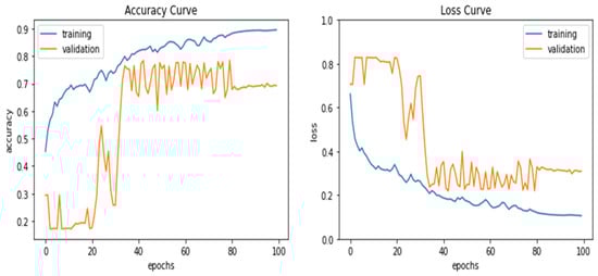 Training and validation curves of accuracy and loss for the RGB case.