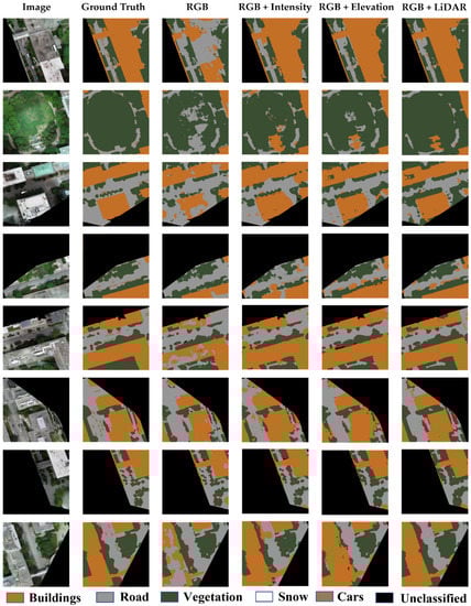 Overall, the results obtained from the validation dataset were largely similar to the results of the first dataset. However, the accuracy of the RGB case was increased by 3%, while the precision, recall, and F-measure were increased by 8% compared to the first dataset. This increase is likely due to the seasonal variations, where the first dataset was collected in the winter with the ground partially covered by the snow, while the second dataset was collected in the spring. For example, the snow covering the rooftop of the building affected the classification accuracy of the first dataset. As can be noticed in the third image of the RGB case in Figure 23, the ground snow was misclassified as buildings. The integration of image/LiDAR data overcame these seasonal variations, as can be seen in the three other cases of the same image. Therefore, the results of the fused data cases in the validation dataset were slightly better compared to the first dataset.