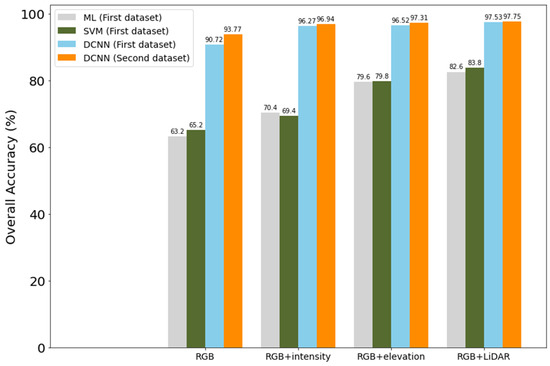 Figure 25 compares the overall classification accuracy of the ML and SVM with the DCNN approach for the four investigated combinations of both datasets. The use of DCNN improved the OA by about 30% in the RGB case and by 15% in the RGB + LiDAR case compared to the ML and SVM techniques.