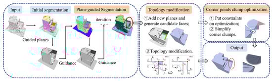 The algorithm divides the building model polygonization problem into four stages: (1) planar extraction based on plane-guided segmentation; (2) topology construction and topology optimization; (3) plane slicing and corner point clump optimization; and (4) polyhedron construction and output. The flow of the proposed method is shown in Figure 1.