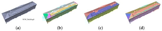Models reconstructed by photogrammetric processes inevitably have some surface defects, such as surface noise, local distortion, local deformations, and missing structures. Furthermore, the surface of a building model is usually covered with some small-scale structures, such as windows, balconies, air conditioning hangers, and tiles. These small-scale structures cause local uneven fluctuations in the plane structure. Defects and small-scale fluctuations in the model surface pose a challenge for planar segmentation. On the one hand, a strict distance threshold or normal threshold of segmentation results in too fine segmentation (oversegmentation) to obtain a concise and complete representation of the building plane, as shown in Figure 2b. On the other hand, this problem can be mitigated by increasing the normal angle threshold and distance threshold of the segmentation process. However, due to the limitations of traditional segmentation algorithms, this strategy leads to boundary crossing of the segmentation (undersegmentation) result, resulting in insufficient extraction of planes and incorrect topological connections between faces, as shown in Figure 2c.