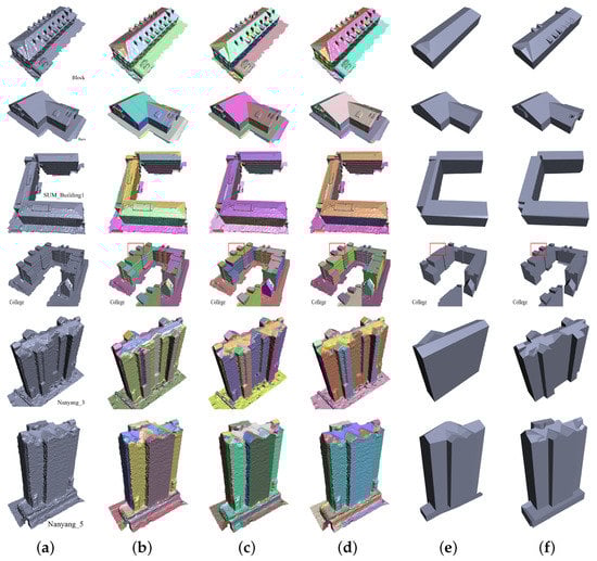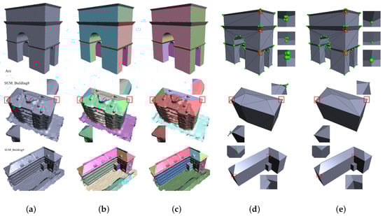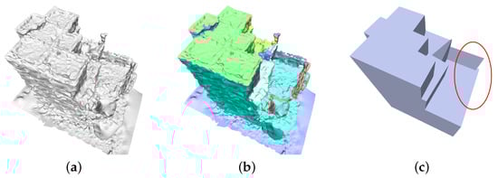 In contrast to other improved methods, such as Li’s method [] due to the use of the “1-ring patch model”, some elongated or narrow structures are ignored in the plane extraction process, as shown in Figure 13c,f. By contrast, our segmentation results can extract these narrow planes and build them successfully in the polygonal model, as shown at the top of the model in Figure 13g.