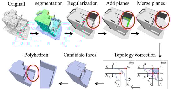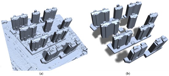 With the development needs of smart cities and digital twins, automatic generation of compact polyhedral building models of large-scale urban scenes from photogrammetric mesh models has received increasing attention. This not only has direct application in urban planning, navigation, real estate, and other GIS fields, but also facilitates the storage, transmission, and drawing of models. Among 3D city objects, buildings are the backbone of many smart city applications. Structure-from-motion (SfM) [] and multiview stereo (MVS) [] can easily reconstruct scenes from images, enabling vectorized modeling of buildings. However, there are still very large obstacles to the practical application of reconstructed building models, mainly due to (1) the large amount of model data and high memory consumption; (2) surface defects, such as surface holes, noise, distortion, and missing structures; and (3) structural features that are not prominent and plane, i.e., straight-line and angular features of a building that are not prominent, concise or intuitive enough. GIS applications require lightweight models with low complexity and high memory requirements [] and must be expressed in a lightweight way through appropriate building polyhedron methods. Therefore, this paper directly focuses on model simplicity and fidelity during building mesh polygonization. We aim to obtain a building polyhedron representation that is sufficiently concise, has low complexity, and is as faithful to the original model as possible.
