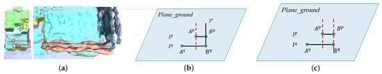 - Adding two new facades—If is not adjacent to any other facade except , then two new facades are needed. The two new facades and pass through the endpoints and . Define the topology of and : and as adjacent and perpendicular to the plane in which and are located, and is connected to the horizontal plane adjacent to the smaller segmented plane in and . The 2-dimensional projection is represented by the red dashed segment in Figure 6c.