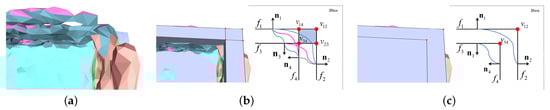 - Topology correction of the inner and outer surfaces of the adjacent thin plates—Since it is difficult for the segmentation model to take into account thin and narrow areas existing in the building structure, the inner and outer surfaces of two adjacent thin plates are also connected incorrectly in the topology diagram, as indicated by the purple curve in Figure 7b. Figure 7b,c are 2D schematics of the local area of the thin plate in Figure 5, where the connection of facades and and and adds two new intersections and , respectively. This adds a very small candidate surface at the corner of the thin-plate structure (the colored area of the 2D schematic in Figure 7b); however, this candidate surface is very easily lost in the optimization process, which eventually causes the thin-plate structure to be missing. In fact, in the actual building structure, and and and should not be connected. To solve this problem, we propose “topology correction of the inner and outer surfaces of a thin plate” to eliminate this kind of incorrect topology connection. Determination of the inner and outer facades of a thin plates: We intersect the center normal of the thin plate with the plane in which all the candidate surfaces are located. If the intersection point is inside the Bbox, then the plane is the inner surface of the thin plate; if there is no intersection point or the intersection point is outside the Bbox, then the plane is the outer surface. According to the geometric rules of the actual building structure, we stipulate that the inner and outer surfaces of the thin plate are not connected to each other, so the incorrect topological connections (the purple connections in Figure 7b) between the inner and outer and and and of the thin plate are eliminated, as shown in Figure 7c. The top of the thin plate is not cut into multiple small areas, which makes it more likely that the thin plate structure will not be lost during optimization.