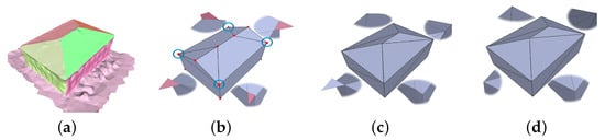 where is the set of candidate planes adjacent to intersection , is the set of all vertices of the nth candidate planes in covering the original region, and is the distance from vertex m to its corresponding candidate plane n. Suppose intersection collapses to intersection . We calculate the cost before the edge collapse operation and the cost after the simulated edge collapse operation. If (the cost decreases after edge collapse), which means the distance between the polygonal model and the original surface decreases and the geometric accuracy improves after processing, then intersection is allowed to collapse to intersection . Conversely, the same strategy is used to simulate the collapse of intersection to intersection until all redundant intersections within the corner point clump are visited; the result of corner point clump optimization is shown in Figure 8d. When the vertex positions of the planar polygons are changed, the original planar polygon may become two polygons that are not coplanar, and new triangles may be generated in this process, but the accuracy of the final model will be improved, and the number of intersection points will be reduced due to the constraint of Equation (3). As shown in Figure 8, the unoptimized RMS (%Bbox ) in Figure 8c is 0.006279, and the RMS (%Bbox ) of our optimized result in Figure 8d is 0.00558.