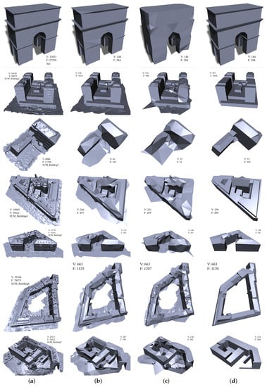 Structural perceptibility: To better reveal the visual quality of the reconstructed building models, we demonstrate a number of individual buildings in Figure 10 and Figure 11. From these visual results, we can see that our approach succeeds in obtaining visually plausible reconstructions despite the buildings having different structures/styles and the input mesh models having different densities and different levels of noise. In the comparison of simplifications, we keep the number of vertices or triangles unchanged and use QEM [] and ACVD [] to simplify models, as shown in Figure 11b,c. Compare to the results of QEM [] and ACVD [], we can see that the planar and linear structures of buildings are more prominent and more structurally aware in our building models. In addition, Figure 10 shows that our method extracts more building details compared to SABMP [], and structural perceptiveness is improved.