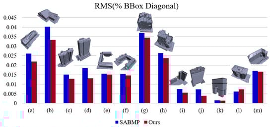 Geometric accuracy is a key metric for evaluating the results and expressing the accuracy of polygon models. We evaluate the closeness of our simplified model to the original model by calculating the Hausdorff distance between the two meshes [], and we calculate the RMS (values with respect to the BBox diagonal) of the polygonal model to the original mesh surface; the results are shown in Figure 17 and Figure 18. Figure 17 compares our method with SABMP [], using the model results shown in Figure 9, Figure 10 and Figure 12.